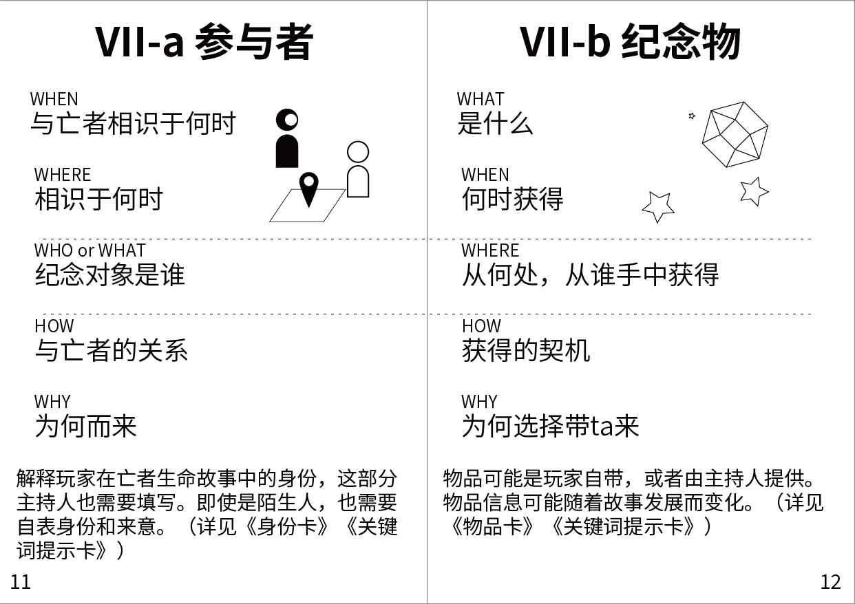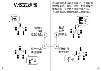 这是一个模拟守灵仪式(的模式)的即兴讲故事游戏。 基础流程很简单:大家围成一个圈,带上和亡者相关的纪念物,每人讲一个与亡者、与物品、与自己相关的故事,轮流讲完后,告别亡者。